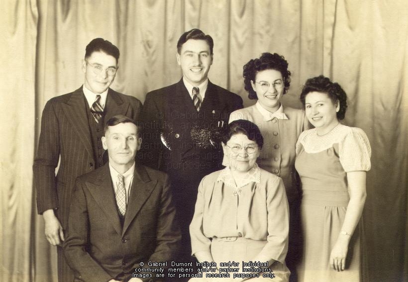 | Description: | Photograph of Howard Adams' family, 1940s. (L-R): Graham, Howard, Olive, Isla; (seated)father, mother. |