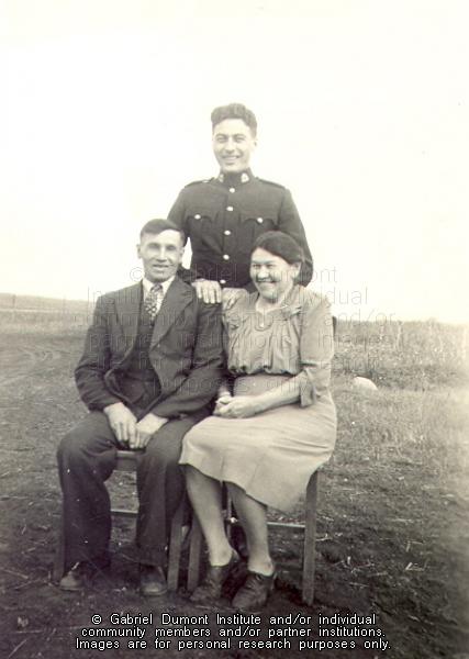 | Description: | Photograph of Corporal Howard Adams and father, Billie and mother, Olive. Photograph is taken outside with Howard's parents seated on chairs. |