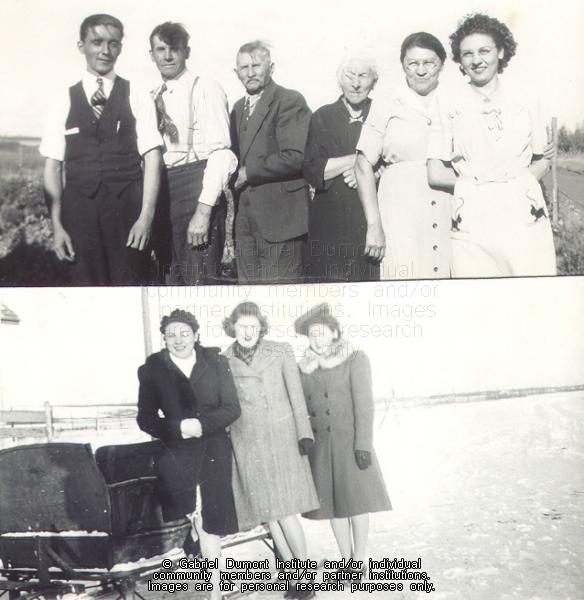 | Description: | Two photographs of the Adams family. Top photograph: (left-right) unknown, father, grandfather McDougall, grandmother McDougall, mother and sister Olive. Bottom photograph Christmas 1941, (left-right)Howard's sisters Olive and Isla and Diane Boucher. |