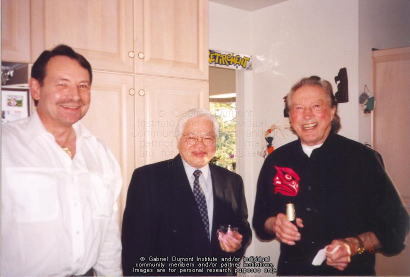 | Description: | Photograph of Howard Adams and two unknown men at a retirement party. |