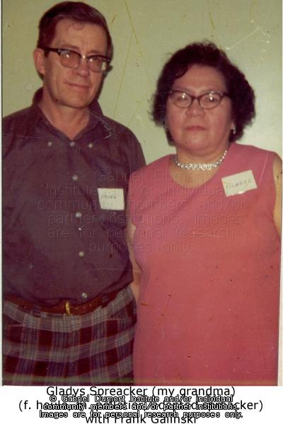 Photo of Gladys Spreacker and Frank Galinski. The Gabriel Dumont Institute is putting this image on this website on behalf of the Spreacker family. As such, the copyright for this image belongs to the Spreacker family. This image must not be reproduced. |
