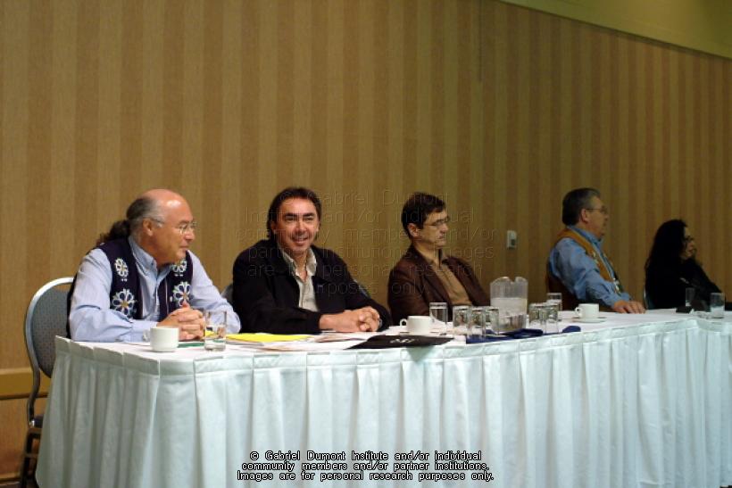 | Description: | Photograph of pannelists at a conference on the Powley decision. Seated left to right: Clément Chartier, Gary Lipinski, Mark Stevenson, Phillip Chartier, Michelle LeClair-Harding. |