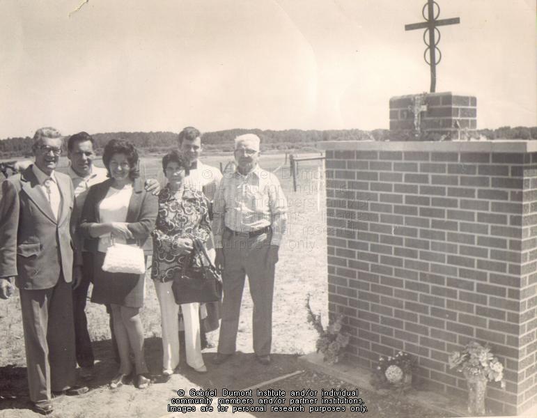 Photograph of six people standing in a cemetery at Round Prairie, Saskatchewan. This image is to be used for research purposes only. The reproduction of this image in whole or in part is strictly prohibited without the permission of the copyright holder. |