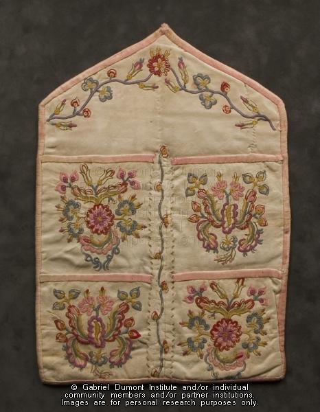 | Description: | Photograph of an embroidered wall pocket - Norway House style. This item is part of the Gabriel Dumont Institute Museum Collection.