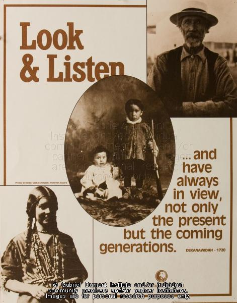 | Description: | Photograph of a poster stressing the importance of education in providing a way of life and survival for future generations. It is based on a quote attributed to Huron leader Dekanawidah.