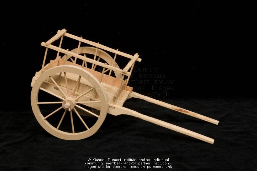 | Description: | Photograph of a wooden scale model of a Red River Cart. This item is part of the Gabriel Dumont Institute Museum Collection. |