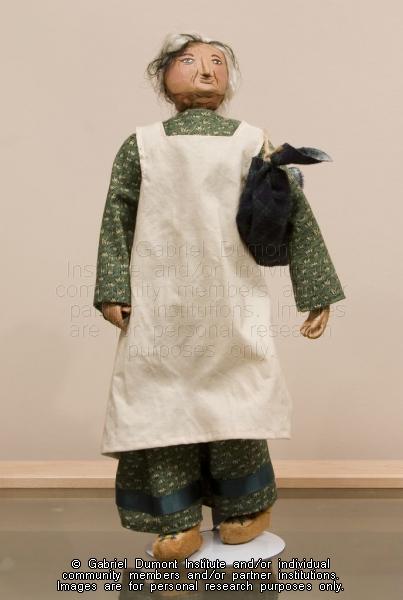 Description: Photograph of papier-mâché doll made by Métis artist Sherry Farrell Racette, from her solo exhibition, Dolls for Big Girls, Rosemont Art Gallery, Regina, 2000. This item is part of the Gabriel Dumont Institute Museum Collection.