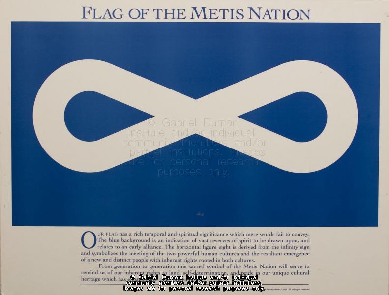 Photograph of a poster portraying the flag of the Métis Nation and a brief description of its significance: "Our flag has a rich temporal and spiritual significance which mere words fail to convey. The blue background is an indication of vast reserves of spirit to be drawn upon, and relates to an early alliance. The horizontal figure eight is derived from the infinity sign and symbolizes the meeting of the two powerful human cultures and the resultant emergence of a new and distinct people with inherent rights rooted in both cultures. From generation to generation this sacred symbol of the Métis Nation will serve to remind us of our inherent rights to land, self-determination, and pride in our unique cultural heritage which has existed since time immemorial." |