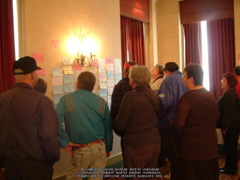 | Description: | Photograph of participants reviewing strategies to preserve the Michif language at the Michif Speakers Conference, March 11, 2006, Saskatoon, Saskatchewan. Delegates from Saskatchewan, Alberta and Manitoba gathered to form the National Michif Speakers Association (NMSA), which consists of Michif-speaking community people dedicated to the protection and promotion of the Michif-Cree language. |