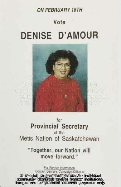 | Description: | "Vote for Denise D’Amour for Provincial Secretary of the Métis Nation of Saskatchewan" election poster. |
