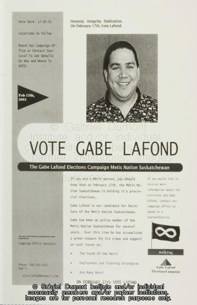 | Description: | "Vote Gabe Lafond for Métis Nation - Saskatchewan Secretary" election poster. |