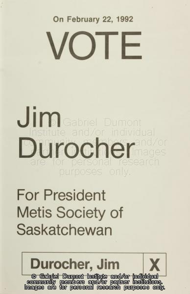 | Description: | "Vote Jim Durocher for President, Métis Society of Saskatchewan" election poster. |