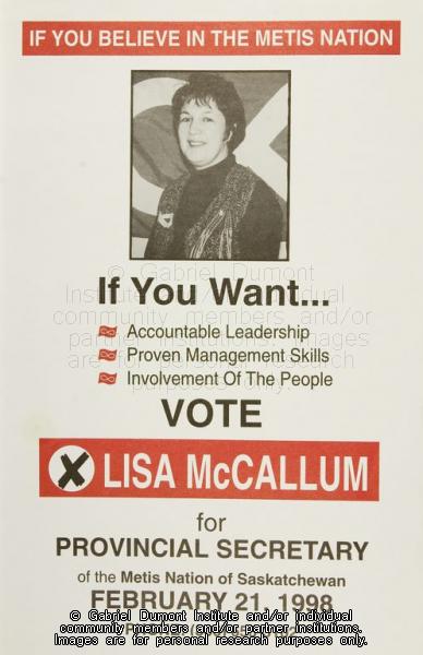 | Description: | "Vote Lisa McCallum for Provincial Secretary of the Métis Nation of Saskatchewan" election poster. |