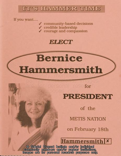 | Description: | "Elect Bernice Hammersmith for President of the Métis Nation" election poster. |