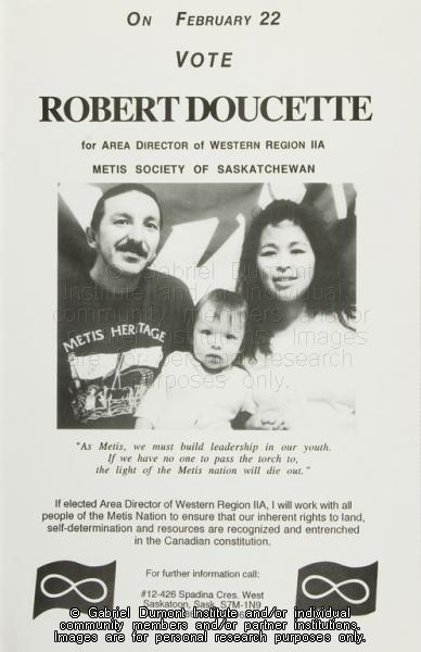 | Description: | "Vote Robert Doucette for Area Director of Western Region IIA, Métis Society of Saskatchewan" election poster. |