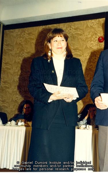 Ethel Blondin, Order of Gabriel Dumont recipient, at the Gabriel Dumont Institute "Education and the Family" Cultural and Educational Conference, Saskatoon, 1991. |