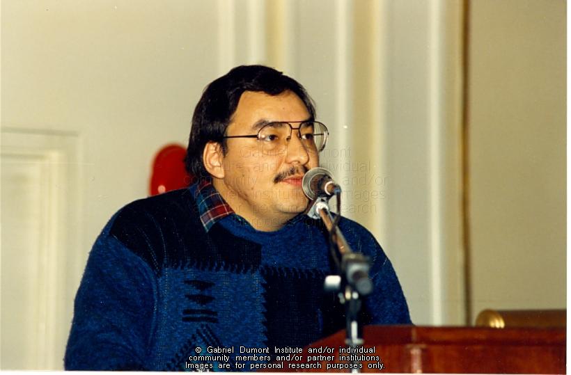 Gerald Morin, Provincial Secretary of the Métis Society of Saskatchewan, at the Gabriel Dumont Institute "Education and the Family" Cultural and Educational Conference, Saskatoon, 1991. |