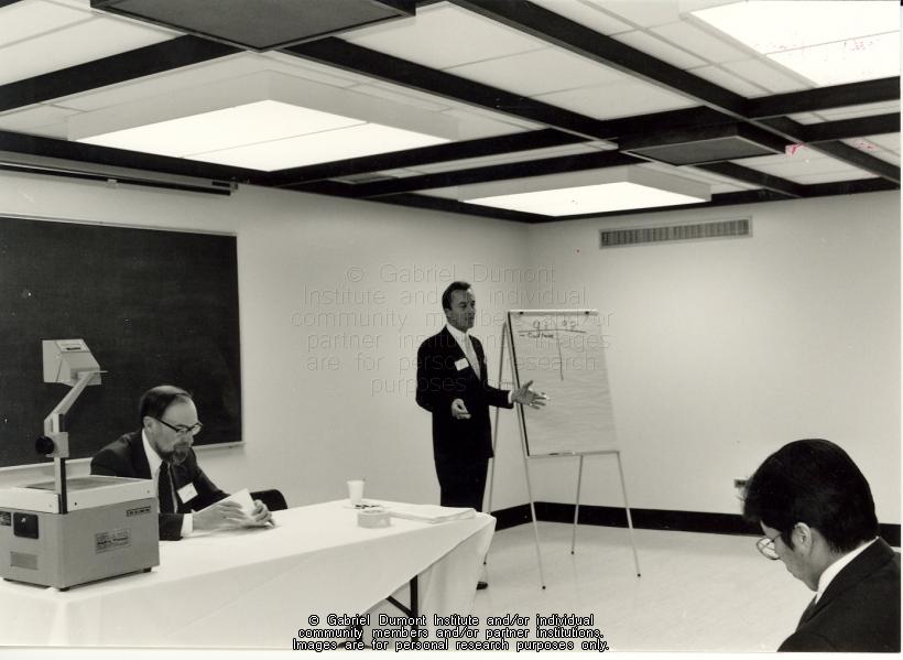 Wayne McKenzie speaking with Larry Heinemann (seated left) at the 1987 Gabriel Dumont Institute cultural and educational conference, Regina.