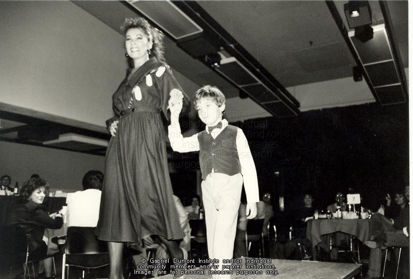 | Description: | Naomi Ross and son modeling during the banquet at the 1987 Gabriel Dumont Institute cultural and educational conference, Regina. |