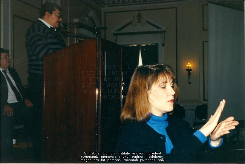 | Description: | Sign Language Interpreter at the Gabriel Dumont Institute "Education and the Family" Cultural and Educational Conference, Saskatoon, 1991. |
