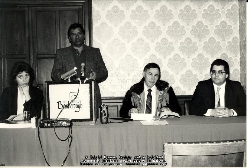 | Description: | Alice Setka (seated left), Jim Sinclair (standing at podium) and Christopher LaFontaine (seated far right), Saskatoon.