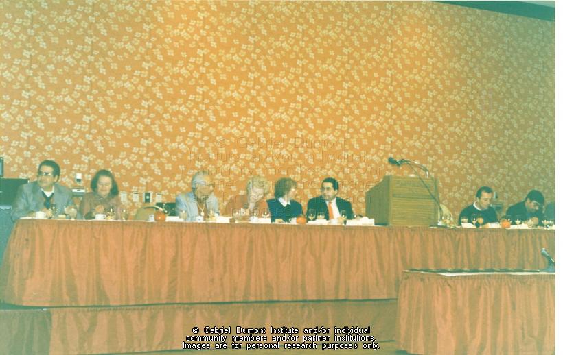 | Description: | Christopher LaFontaine (seated to the left of the podium) and Jim Sinclair (seated far right), Saskatoon. |