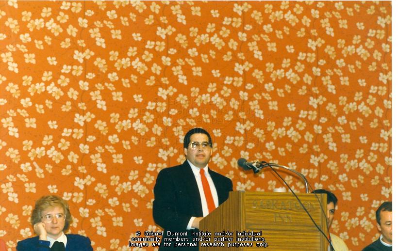 | Description: | Christopher LaFontaine speaking at a Gabriel Dumont Institute Cultural Conference, Saskatoon.
