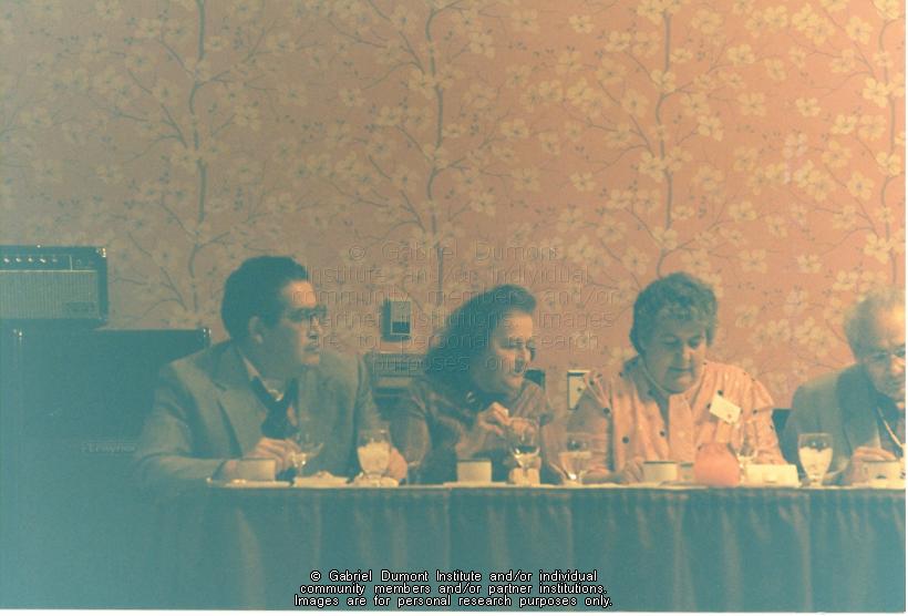 | Description: | Napoleon LaFontaine (left) and Grace Hatfield (second from right) at a Gabriel Dumont Institute Cultural Conference, Saskatoon.