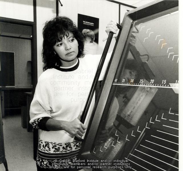 | Description: | Gabriel Dumont Institute student Valerie Cardinal at work at graphic arts production at SIAST Wascana Campus, Regina. |