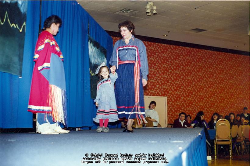 | Description: | Marilyn Belhumeur (right), and an unidentified woman and girl during the fashion show at a Gabriel Dumont Institute Cultural Conference, Saskatoon. |
