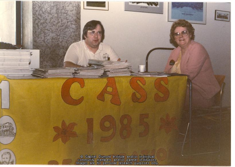 | Description: | Registration Table for the class of 1985 at a Gabriel Dumont Institute cultural conference.