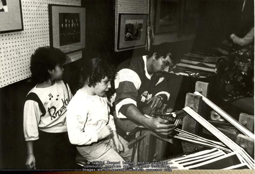 | Description: | A Finger weaving demonstration being shown to children at the 1993 Gabriel Dumont Institute cultural and educational conference in Saskatoon. |