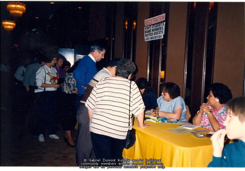 | Description: | Delegates registering at a Gabriel Dumont Institute cultural conference. |