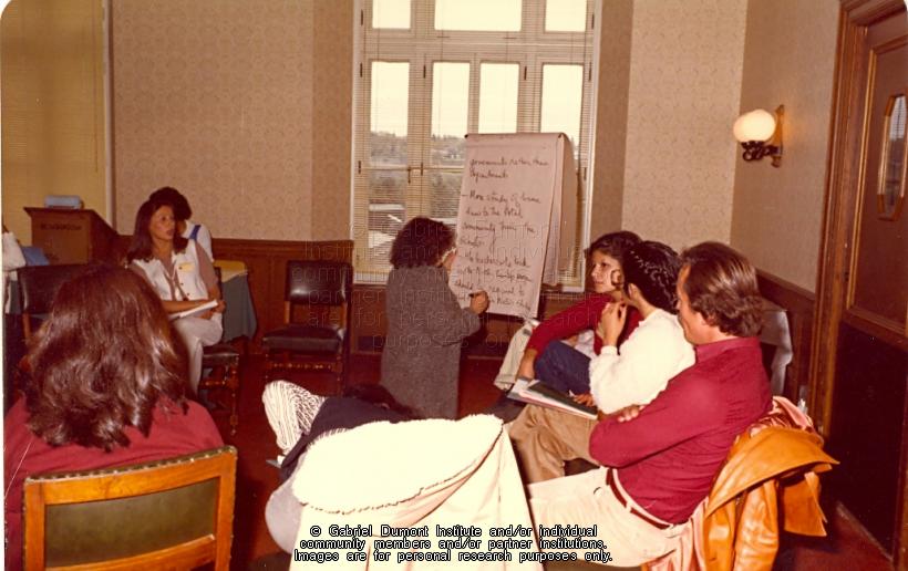 | Description: | Session with Rita Bouvier at an early Gabriel Dumont Institute cultural conference. |