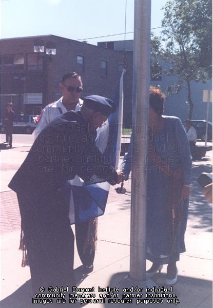 | Description: | Honour Guard with Max Lucier at flag pole in front of City Hall in Prince Albert just before the Métis Veterans' book launch. |