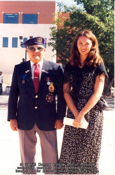 | Description: | Frank Tomkins with Leah Dorion in front of City Hall in Prince Albert just before the Métis veterans' book launch. |