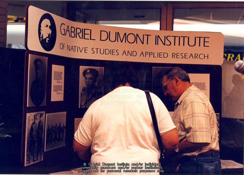 | Description: | A couple looking Gabriel Dumont Institute display at book launch of Remembrances: Métis Veterans in Prince Albert. |