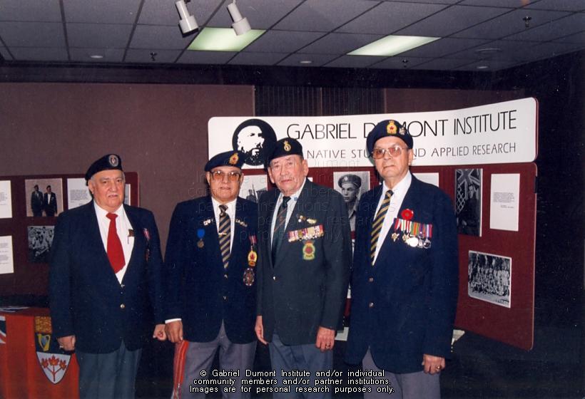 | Description: | Cliff Hessdorfer, Frank Tomkins, Leon Ferguson, and Charlie Umpervile at the launch of Remembrances: Interviews With Métis Veterans in Saskatoon. |