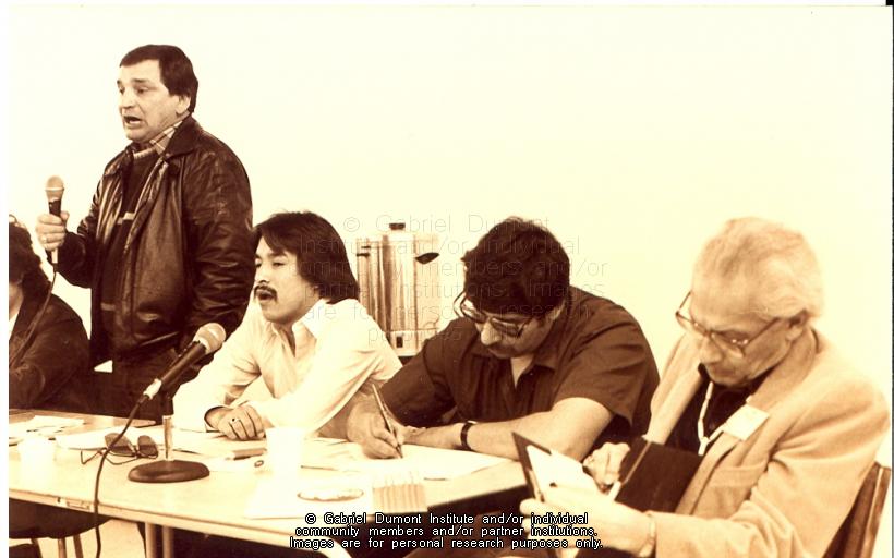 This photograph was taken during the opening conference for the Gabriel Dumont Institute in 1980. In 1976, an assembly of the Association of Métis and Non-Status Indians (AMNSIS) voted to create an educational and cultural institution for the province`s Métis and Non-Status Indians. In this photograph, Jim Durocher speaks to the AMNSIS membership regarding the new institution`s mandate. |