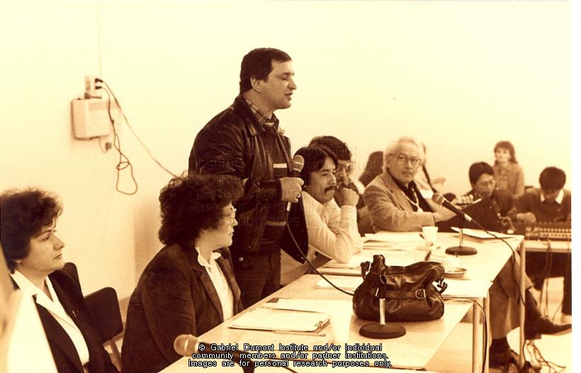 This photograph was taken during the opening conference for the Gabriel Dumont Institute in 1980. In 1976, an assembly of the Association of Métis and Non-Status Indians (AMNSIS) voted to create an educational and cultural institution for the province`s Métis and Non-Status Indians. In this photograph, Jim Durocher explains the new institution`s mandate to the AMNSIS membership. Seated at the far right is Dr. Walter Curry, the Institute`s first executive director.