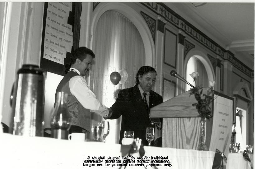 | Description: | Allan Bork shaking hands with Murray Hamilton at SUNTEP Saskatoon graduation. |