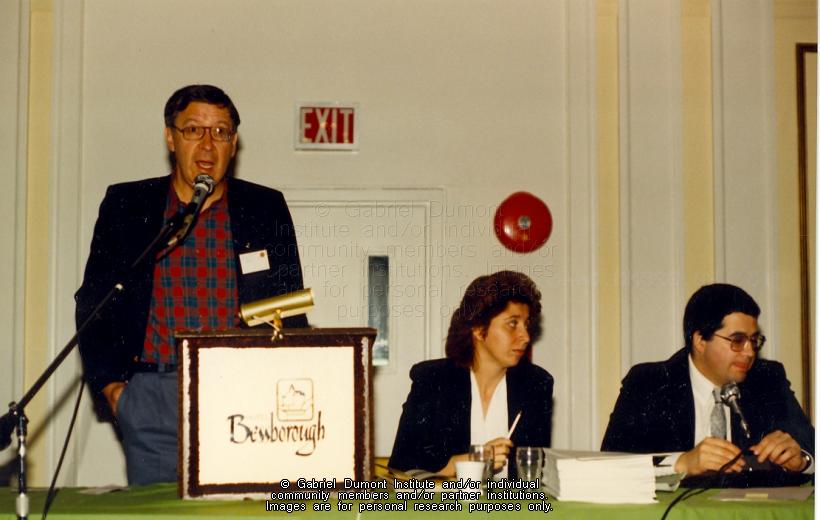 | Description: | Albert Robillard speaking with Alice Setka and Christopher LaFontaine at a Gabriel Dumont Institute cultural conference. |