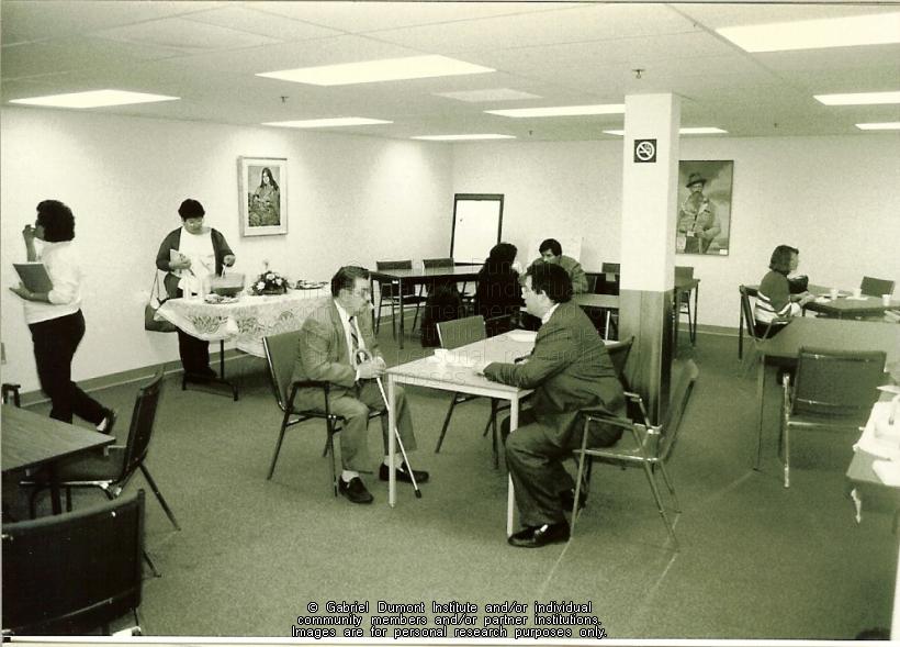 | Description: | Christopher LaFontaine speaking to an unknown man at the grand opening of the Gabriel Dumont Institute in Prince Albert in 1988. |