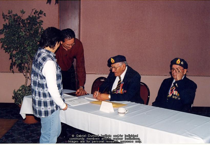 | Description: | Edward King signing book at the launch of Remembrances: Interviews with Métis Veterans in Saskatoon. |