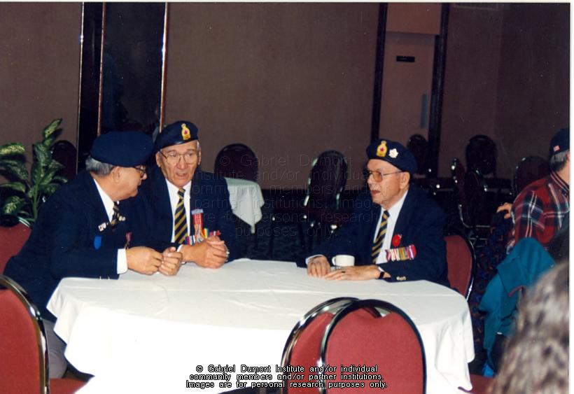 | Description: | Frank Tomkins, Edward King, and Charlie Umpherville at the Remembrances: Interviews with "Métis Veterans, Remembrances" launch in Saskatoon in 1997. |