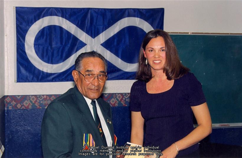 | Description: | Maurice Blondeau with Leah Dorion at the launch of "Remembrances: Interviews with Métis Veterans" in 1998 in Regina.
