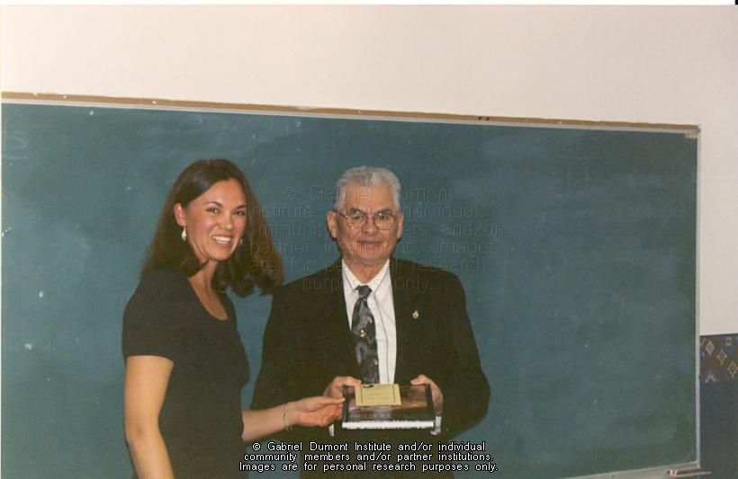 | Description: | Leah Dorion with Peter Pelletier at the launch of "Remembrances: Interviews with Métis Veterans" in 1998 in Regina.