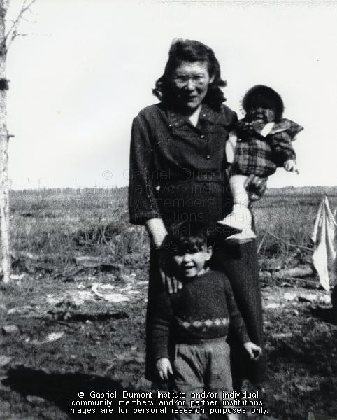 Melanie (Bella) Fiddler holding Marilyn Arnault (wife to Ronald Bundschun). The little boy standing in front is Lawrence Arnault. This image is to be used for research purposes only. The reproduction of this image in whole or in part is strictly prohibited without the permission of the copyright holder. Copyright for this image belongs to Lawrence Arnault, and/or the person(s) in the photograph, and/or their descendants. |