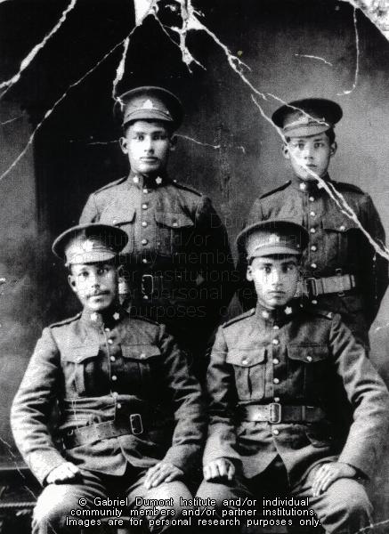 Front: Paul Morin (left) and Norbert Morin. Standing back: Baptiste Gerard (left) and Peter Morin. This image is to be used for research purposes only. The reproduction of this image in whole or in part is strictly prohibited without the permission of the copyright holder. Copyright for this image belongs to Lawrence Arnault, and/or the person(s) in the photograph, and/or their descendants. |