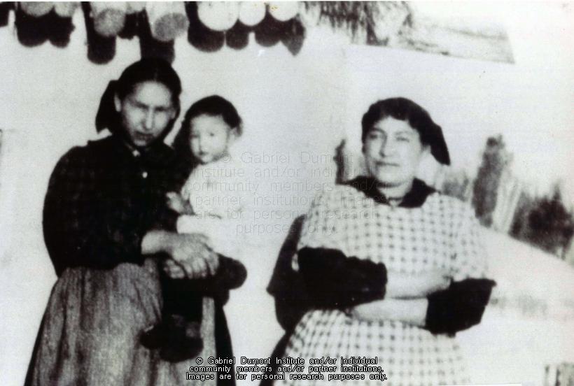 At right is Annie Johnson, who was a midwife in the early days at Île-à-la-Crosse. The woman on the left is the wife of Edward Lariviere. This image is to be used for research purposes only. The reproduction of this image in whole or in part is strictly prohibited without the permission of the copyright holder. Copyright for this image belongs to Lawrence Arnault, and/or the person(s) in the photograph, and/or their descendants. |